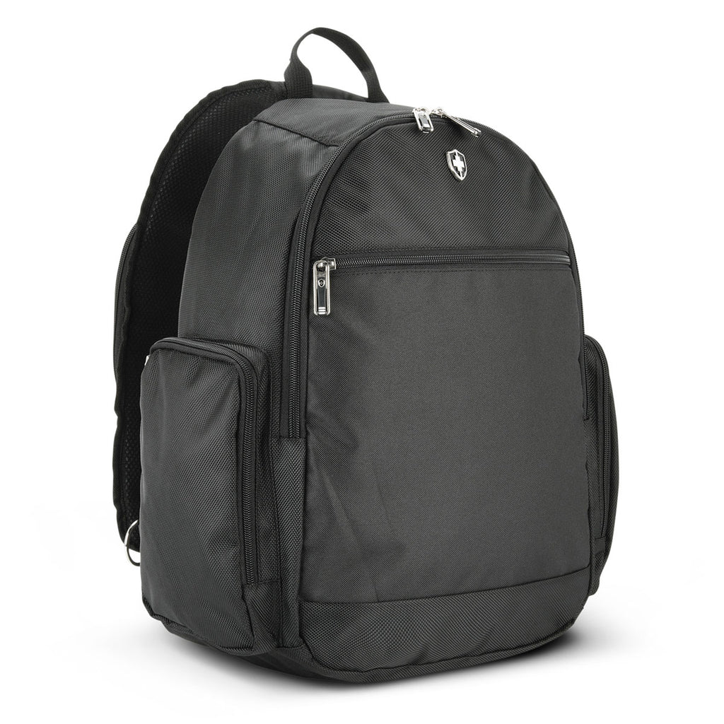 Company sponsored outings, presentations, 5K events, vacations abroad, and literally any spot where your laptop, or better yet, portable workstation can be used, the custom logo Merchology Black Swiss Peak Sling Laptop Backpack follows. Therefore, the obvious choice is to utilize the bag's eye-catching design by including your corporate logo and hence, build awareness.