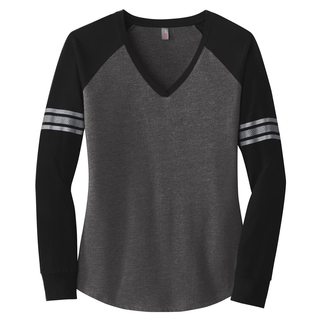 Hit a fashion home run by wearing the embroidered District Made Women's Heathered Charcoal/Black/Silver Game Long Sleeve V-Neck Tee. Put on the crossover v-neck shirt as an only layer for a softball game or as the first layer to protect you against cold temperatures. The elegant curved hem and solid print stripes on the sleeves separate the long sleeve tee from the corporate apparel competition. Blended ring spun combed cotton and rugged polyester ensures you enjoy the stylish tee for years to come. Add a custom logo on the large imprint area to get the word out about your company in the community.