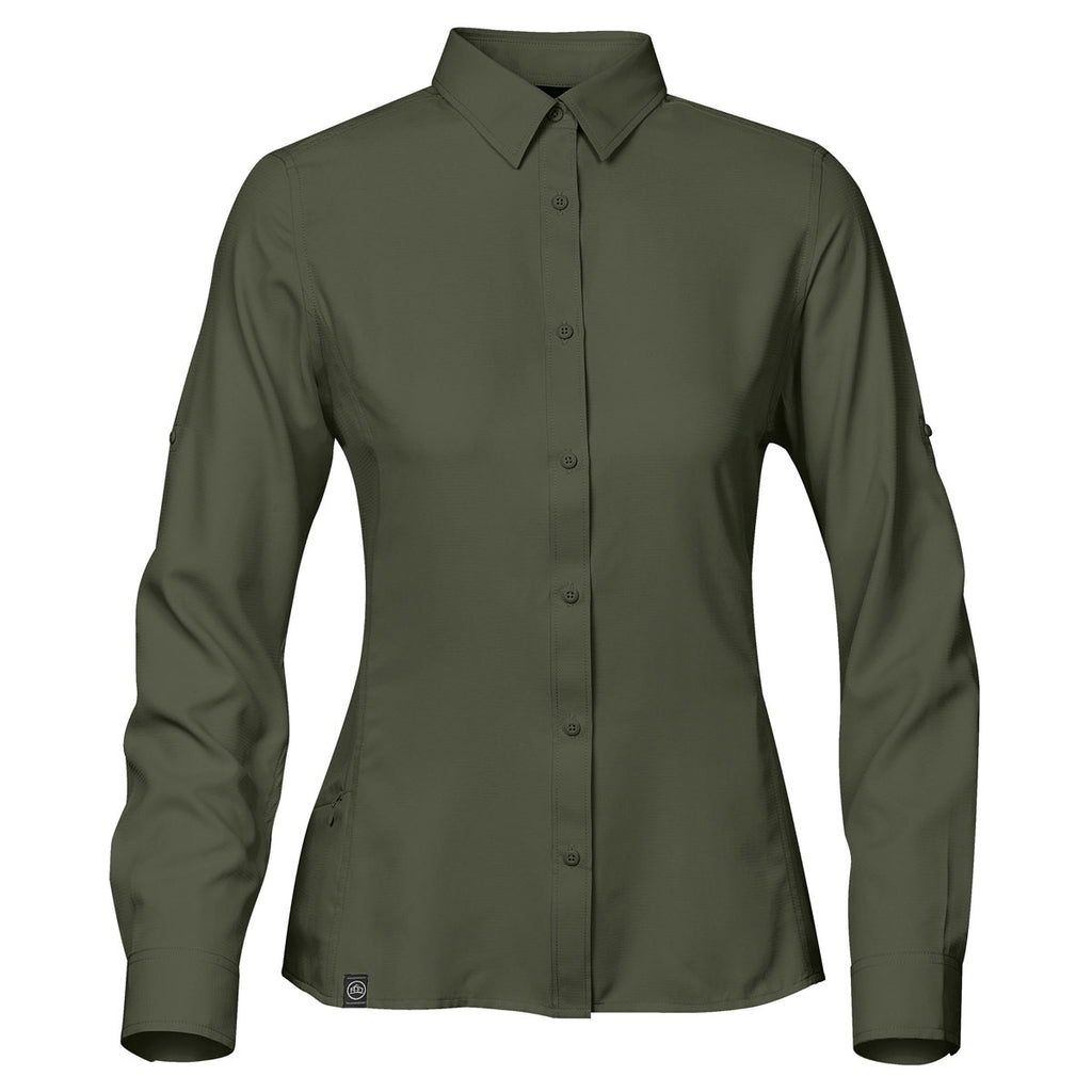 For a stylish, long-sleeve shirt for employee uniforms, look no further than the Stormtech Women's Moss Safari Shirt. With ample room for your company logo and numerous features wearers will appreciate, it's an ideal choice. It has a quick dry, water-repellent fabric that is not only comfortable, but ventilated. Roll-up sleeve tabs allow the shirt to be worn with sleeves folded up for a more casual style while a tailored collar ensures a neat and tidy look. It even offers UPF 50 protection from the sun's UV rays which makes it a good choice for outdoors.