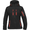 High performance meets fitted style in the Stormtech Women's Black/Flame Red Expedition Softshell. This weather-resistant coat features sealed seams, a storm hood, waterproof zippers, and a waterproof outer shell. Add your company logo and give it to employees as a gift or add your team logo and wear it as part of a uniform.