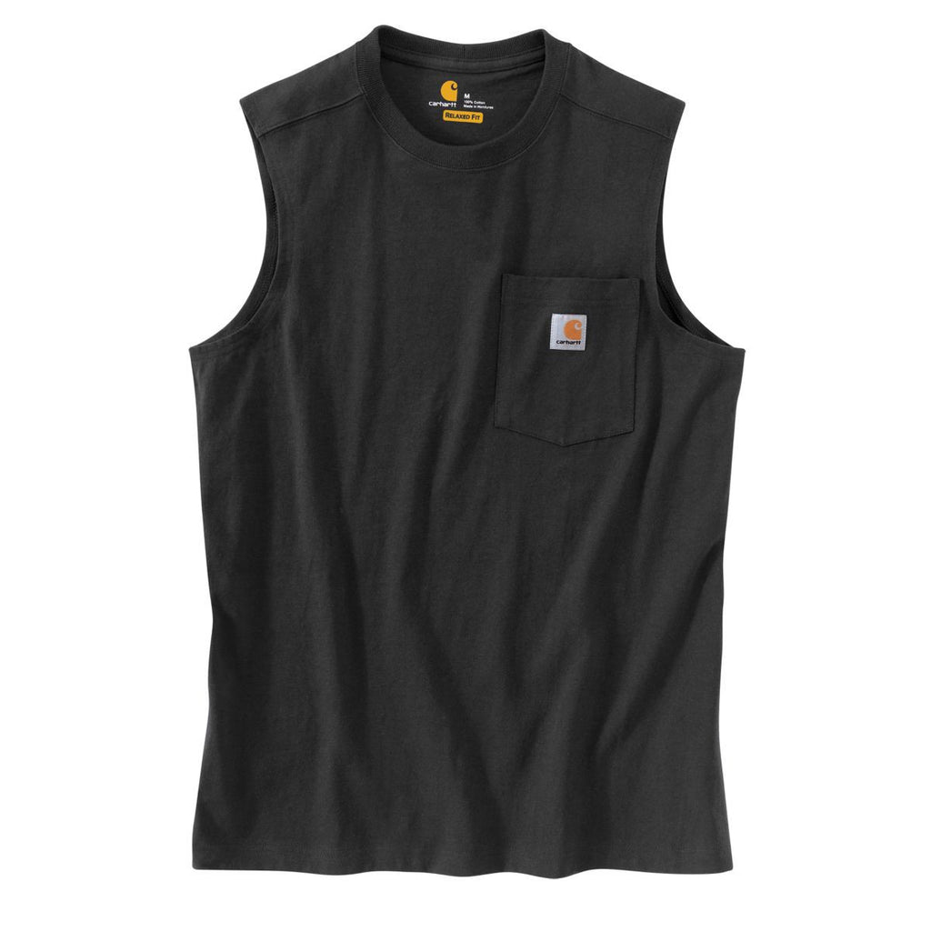 Carhartt Men's Black Workwear Pocket Sleeveless T-Shirt offer multi-purpose use, from working out at the gym to spending a Saturday afternoon at the office catching up on customer requests. The 100% cotton jersey shirts include a rib-knit crewneck to enhance breathability. Add a custom logo to the right chest to promote your company during recreation league games Side seam design minimizes the twisting of the soft cotton fabric. This line of highly durable men's sleeveless shirts handles well under normal washing and drying conditions. Carhartt uses technology that prevents colors from bleeding during wash and rinse cycles.