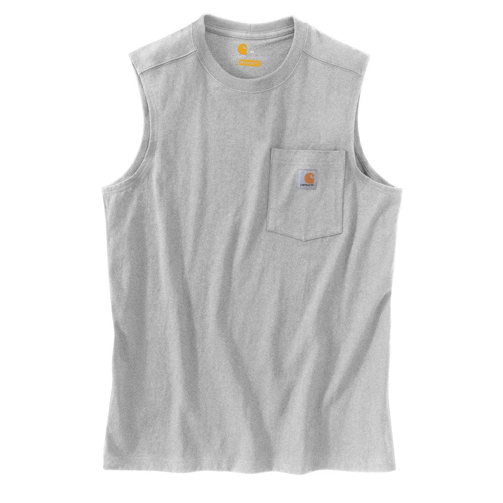 Carhartt Men's Heather Grey Workwear Pocket Sleeveless T-Shirt offer multi-purpose use, from working out at the gym to spending a Saturday afternoon at the office catching up on customer requests. The 100% cotton jersey shirts include a rib-knit crewneck to enhance breathability. Add a custom logo to the right chest to promote your company during recreation league games Side seam design minimizes the twisting of the soft cotton fabric. This line of highly durable men's sleeveless shirts handles well under normal washing and drying conditions. Carhartt uses technology that prevents colors from bleeding during wash and rinse cycles.