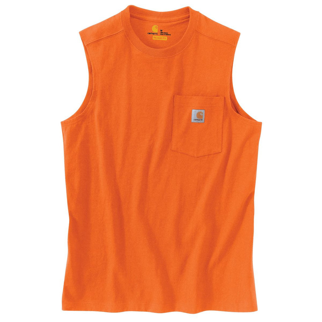 Carhartt Men's Orange Workwear Pocket Sleeveless T-Shirt offer multi-purpose use, from working out at the gym to spending a Saturday afternoon at the office catching up on customer requests. The 100% cotton jersey shirts include a rib-knit crewneck to enhance breathability. Add a custom logo to the right chest to promote your company during recreation league games Side seam design minimizes the twisting of the soft cotton fabric. This line of highly durable men's sleeveless shirts handles well under normal washing and drying conditions. Carhartt uses technology that prevents colors from bleeding during wash and rinse cycles.