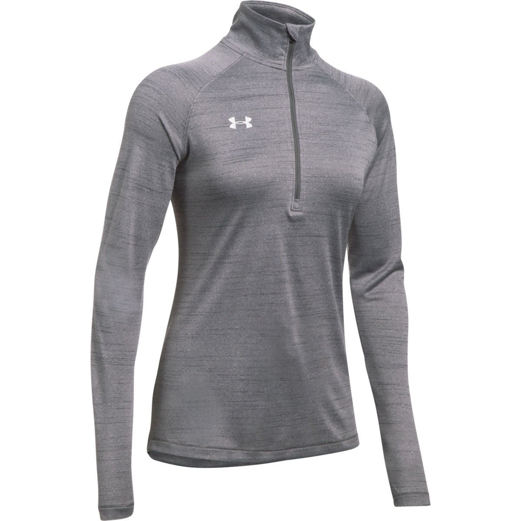 If you're interested in the warmth and protection of a 1/4 zip but not the usual bland style, there may be no better option for you than the Under Armour Women's Graphite Steel Stripe Tech 1/4 Zip. This microstripe zip is comfortable, light, and 100% polyester, featuring Flatlock raglan sleeves. The updated Tech fabric has a softer, more natural feel for all-day comfort to keep you moving. Add your own embroidery or custom logo and you'll stand out from the crowd in style.