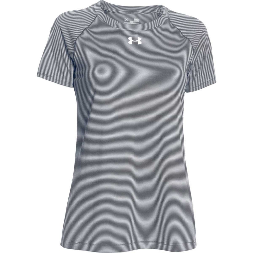 What if there was a short-sleeve tee that was just as high-tech as any gadget you take along your usual running route? This Under Armour Women's Graphite UA Stripe Tech Locker Short Sleeve Tee might not be able to play MP3 files for you, but otherwise-we think it's pretty close. It starts with the fabric itself: UA Tech fabric that's soft and feels natural. The Signature Moisture Wicking system is something like a private cooling system. And the lightweight, stretchy construction? You'll feel like you're wearing something a little more sophisticated than a T-shirt. With your added logo on this short sleeve option, you can represent your brand-which means you can look cool while staying cool.