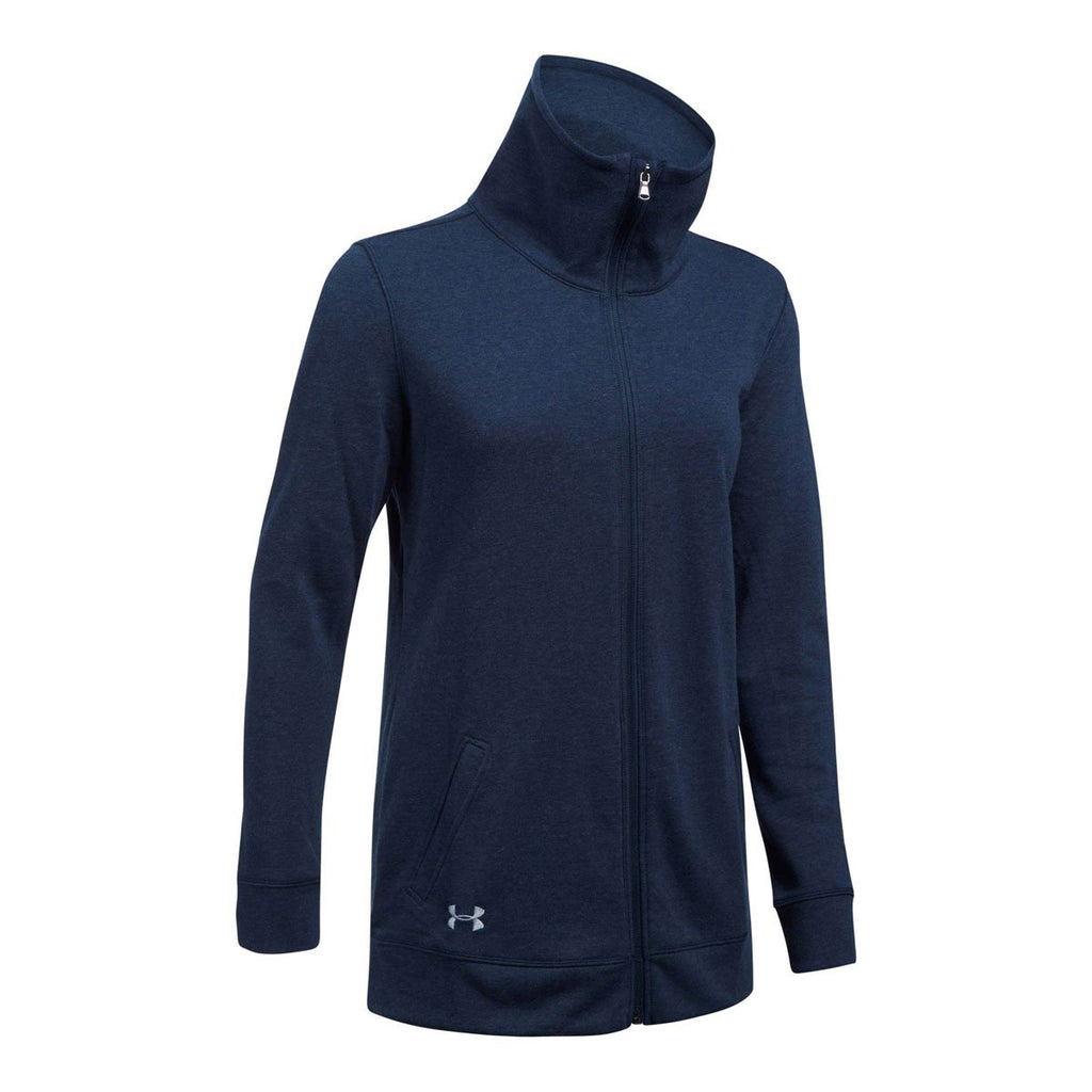 With a generous, more relaxed fit, the logoed Under Armour Women's Midnight Navy Team Traveler Jacket from Under Armour never clings to the skin or chafes the body to offer supreme comfort. Super smooth French Terry fabric contains moisture wicking technology. Cotton and polyester combine to form a powerful fashion punch by delivering a soft feel, while not compromising high durability. The spacious funnel neck and adjustable draw cords create the perfect fit for all occasions. Add a custom logo to spread the word about your company at professional networking events.