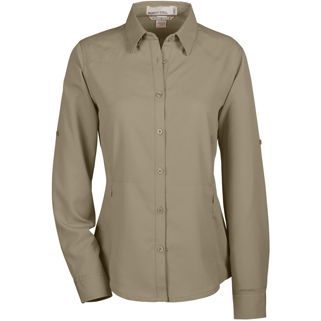 Adjustable cuffs allow you to roll up the sleeves on the North End Women's Stone Excursion Concourse Performance Shirt, whenever you need to pick up the pace on a work project. Rugged polyester includes moisture wicking technology to keep you cool during high-pressure events. The two-tone melange polyester presents a subtle, yet aesthetically appealing design that works in most professional environments. Double-needle flat felled side and underarm seams do an excellent job of preventing rips and tears to the fabric. The back yoke that includes side pleats adds a unique fashion touch to this versatile work shirt.
