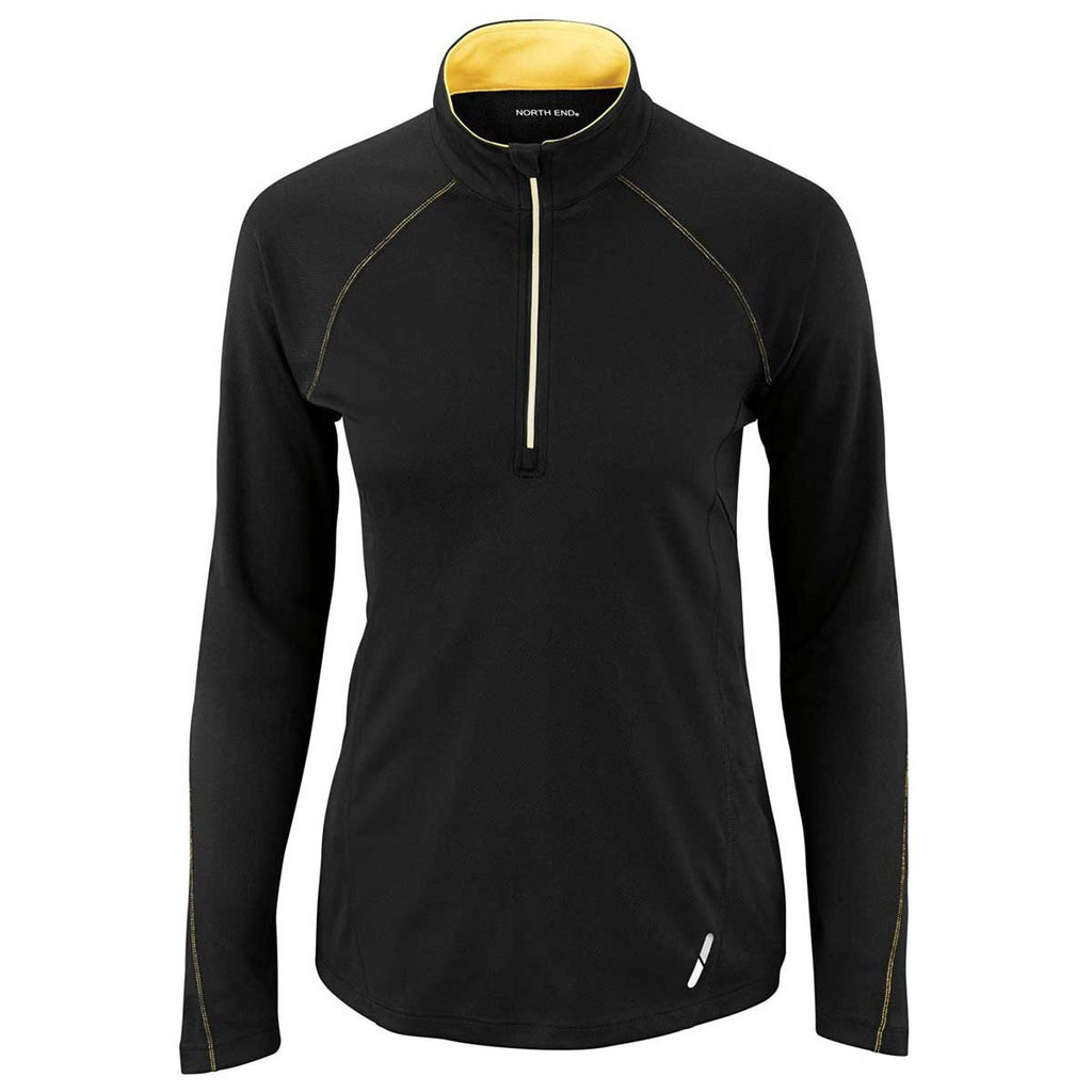 The North End Women's Black/Campus Gold Radar Half-Zip Performance Long-Sleeve Top includes an inside placket and chin guard that complements the stylish rolled collar. Wear this quarter zip to casual company outings and civic events, but make sure to place your corporate logo on the large chest imprint area. Moisture wicking technology keeps you comfortable during the most intense workouts. Rugged polyester interlock resists the types of rips and tears that render other quarter zips obsolete. The center front semi-automatic lock zipper includes a rubber pull tab for convenience. Several storage pockets allow you to have instant access to your electronic devices.