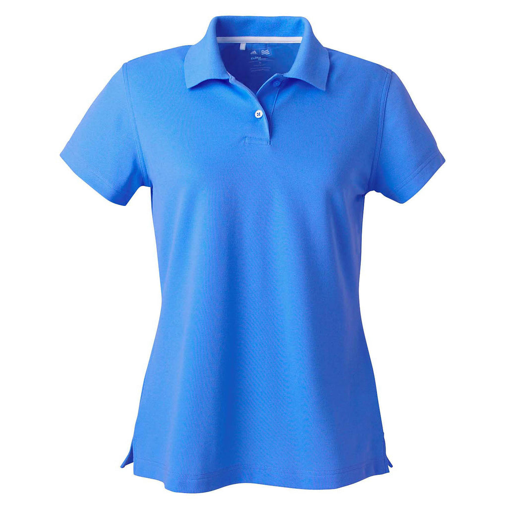 The adidas Golf Women's ClimaLite Gulf Blue Pique Polo is made with a cotton/poly blend that has a hydrophilic finish. It features a rich-knit collar, two-button placket, contrast 3 stripes at the center back yoke and logos on the right sleeve and open-hem sleeves.