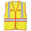 The 100% polyester oxford CornerStone Men's Safety Yellow/Safety Orange ANSI 107 Class 2 Dual-Color Safety Vest utilizes a different approach to keeping you visible throughout your construction shift. CornerStone uses either bright orange or yellow as the dominant vest color. Instead of running reflective taping in lines along the front and back, CornerStone takes the secondary color and runs it in a rectangle over a block of the reflective taping. Dyed-to-match binding and Vislon zipper mesh enhance breathability of the vest. Rugged polyester oxford absorbs nightly abuse, as well as comes out of every construction shift odor and stain-free. Use the lower pockets to store pens and notepads, while adding your company logo over the left chest.