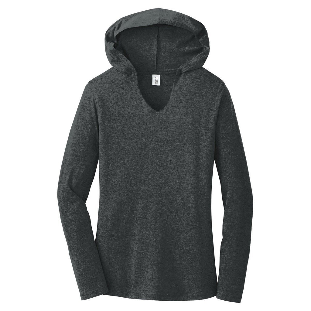 District Made Women's Black Frost Perfect Tri Long Sleeve Hoodie makes the ideal corporate gift to reward the sales goal exceeded by your team of accomplished employees. The logoed corporate garment includes a large imprint area to add a custom logo that generates buzz for your company in the community. Three materials blend together to create a durable hoodie that feels super smooth on the skin. Wear the hoodie as an outer garment to a professional networking event and use the chic hoodie as an inner layer to keep you warm on frigid winter days. The split V-neck and raw edge design raise the bar for corporate fashion excellence.