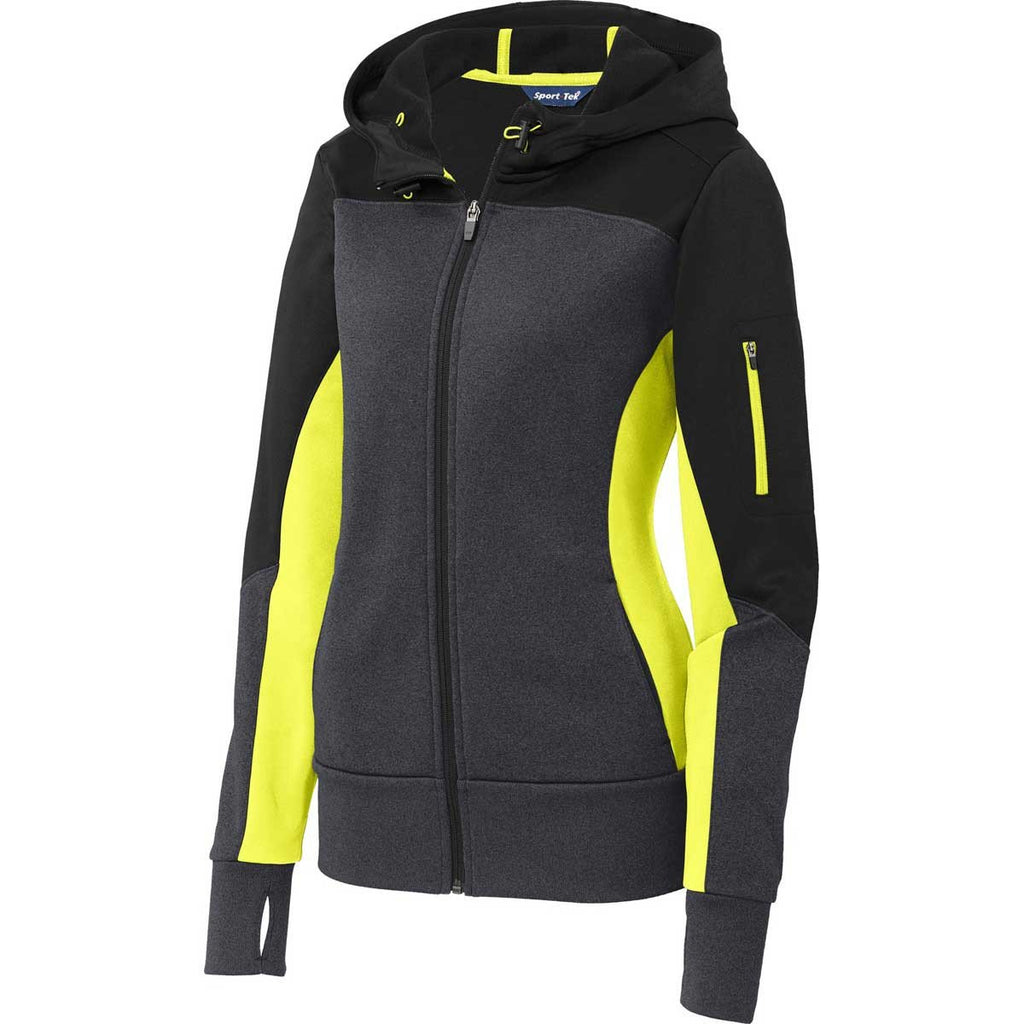 Sport-Tek Women's Black/Graphite Heather/Citron Tech Fleece Colourblock Full-Zip Hooded Jacket