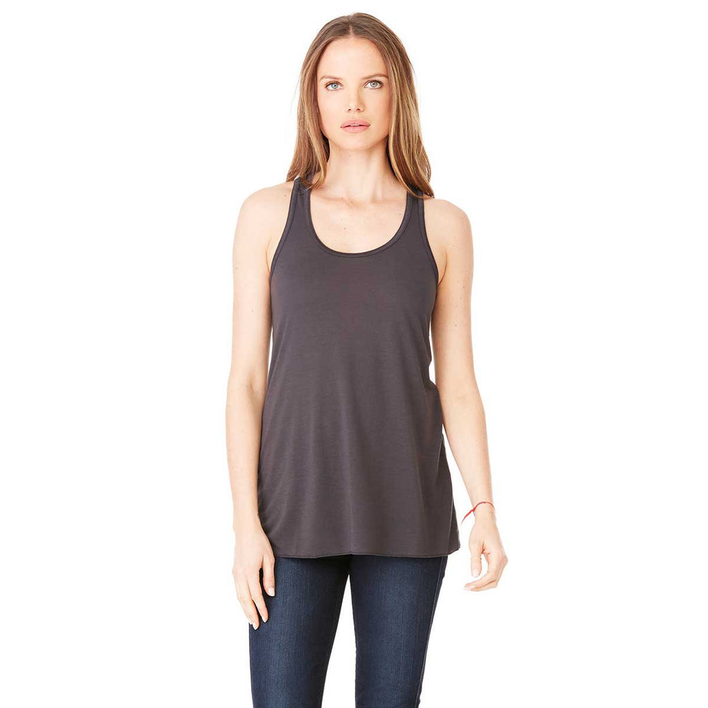 Tank tops rarely go hand in hand with stylish design, but the Bella + Canvas Women's Dark Grey Flowy Racerback Tank changes the tank design paradigm. The merrowed bottom hem and easy, loose fit make the tank a hit among fashion conscious professionals that need to let off a little steam after work. Attach your corporate logo to the tank for increasing brand awareness, as you mingle on the deck of a popular restaurant. Side seam stitching keeps the tank intact years beyond the average tank top lifespan. This tank contains 65% polyester and 35% viscose to deliver superior long lasting performance.