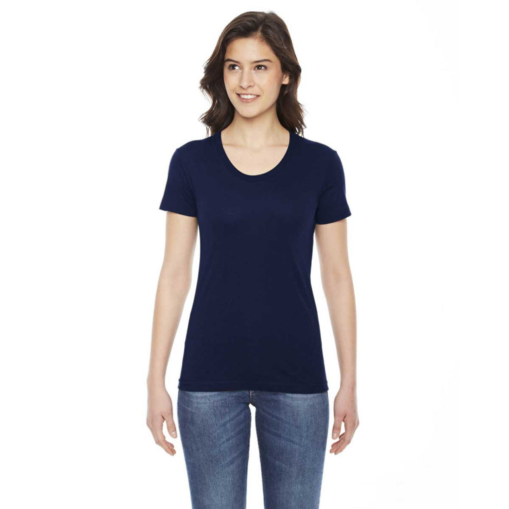 Ever wanted a comfortable T-shirt that didn’t try to be something it’s not? We’ve got a T-shirt that knows what it is and does it extremely well. This T-shirt is comfortable thanks to a 50/50 poly-cotton blend —which is exactly what a tee should be. It’s form fitting, with a durable rib neckband and comfortable shoulders—exactly what a tee should be. The only thing this American Apparel Women's Navy Poly-Cotton Short-Sleeve Crewneck is missing to become the ideal T-shirt is your own custom logo printed on the front.