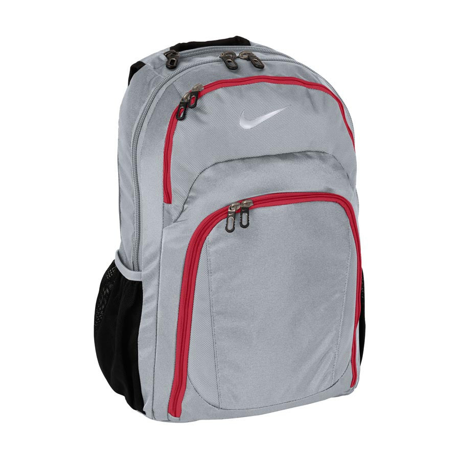 This backpack is equipped with a padded laptop sleeve, a padded tablet sleeve, and front zipper pockets and an organizational panel to store your smaller items. It has outer mesh pockets to carry water bottles or beverages. Not only was the Nike Golf Wolf Grey/Gym Red Dri-FIT Backpack made to protect your electronics, but it was also made for ease and comfort with curved, padded shoulder straps. Rest assured that your contents in this bag will be safe while traveling or simple day-to-day travels! Includes a large front panel for use in embroidery of a logo.Decoration location: Front panel