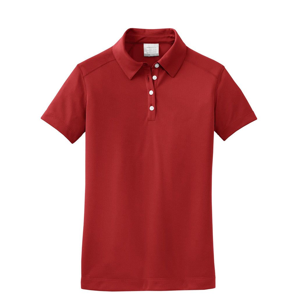 The Nike Golf Women's Dri-FIT Red Pebble Texture Polo is made up of 100% lightweight polyester, pearlized buttons, a Swoosh trademark design on the left sleeve, a self-fabric collar and a 4-button placket. It also has Nike Golf's trademark Dri-FIT moisture-wicking technology that will keep the wearer cool and dry.