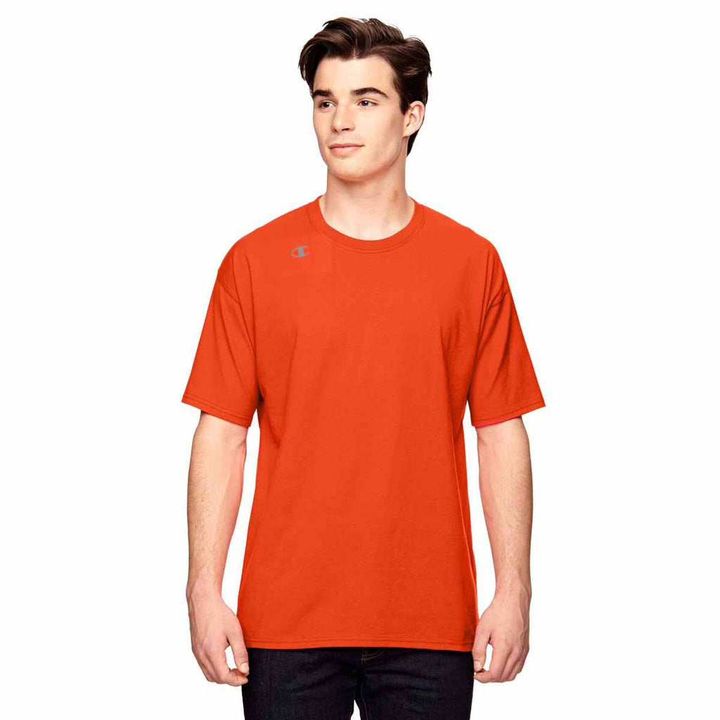 Champion custom embroidered shirts offer you the ideal platform to market your company in the community. The Champion Men's Sport Orange Vapor Cotton Short-Sleeve T-Shirt includes an area where you can attach your corporate logo to promote your company everywhere you go. Designed with 60% cotton and 40% polyester jersey, this t-shirt delivers both rugged durability and unsurpassed comfort. The blended fabric stretches to give you plenty of movement and flexibility. Adaptive moisture wicking technology keeps you comfortable throughout your busy day. UV protection makes this t-shirt the perfect garment to wear during the dog days of summer.